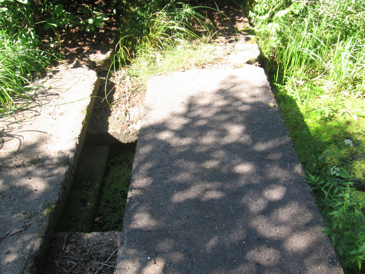 Переехал реку Дорожбитка, рядом за деревьями угадывалось озеро Сосно. Потом высота Абашина. Далее дилемма. Сразу поехал направо в объезд «Апофеоза Минкевича». Это втрое дольше. Но тут песок. Поспешил вернуться. Дорога напрямки к предполагаемому лагерю «Минкевич Костя1» километра два. Но сплошь заросла. К тому же идет по конгломерату плит. В виде тех же плит два мостка. Слева живописное и глухое озеро Лешно. Справа застойное болото с насекомыми всех размеров, источающее на жаре тяжелые миазмы. Первый мостик харизматичный.