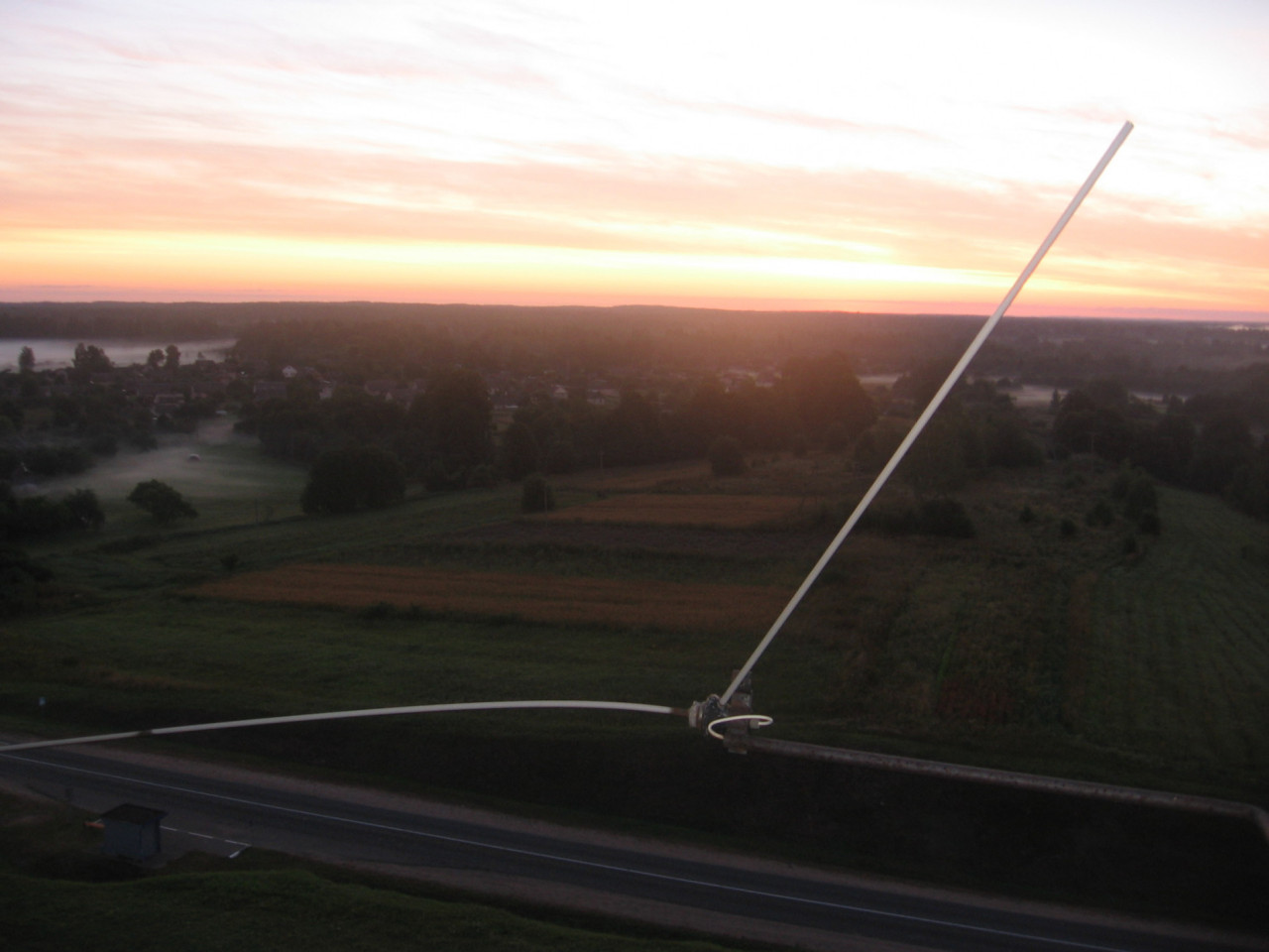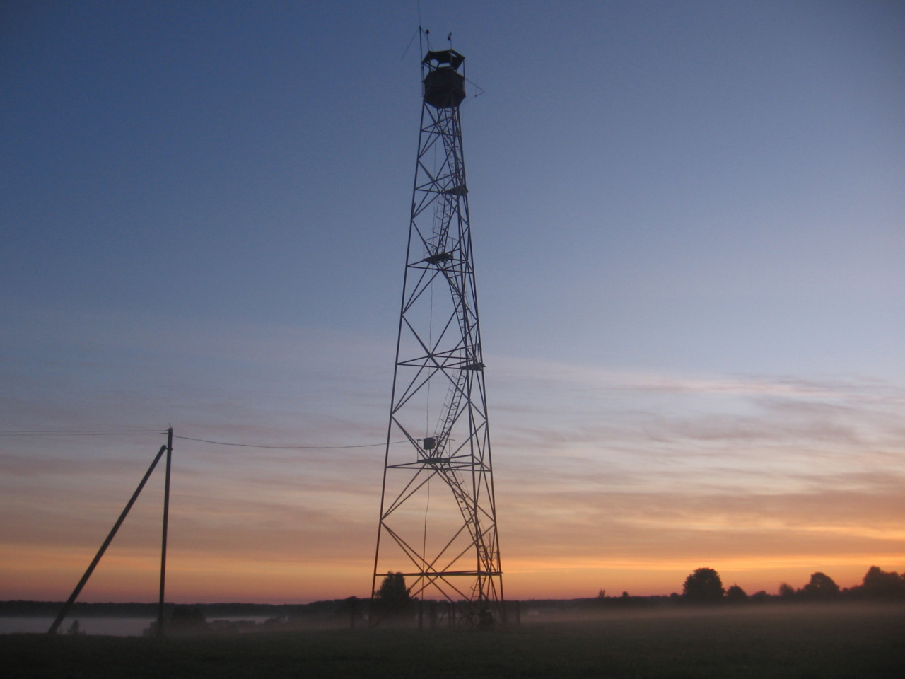 Высота метров тридцать. Оборудование с вышки спиздили. Даже влезли в распределительные коробки. Но от ближайшего столба к ней, вышке, был переброшен провод.