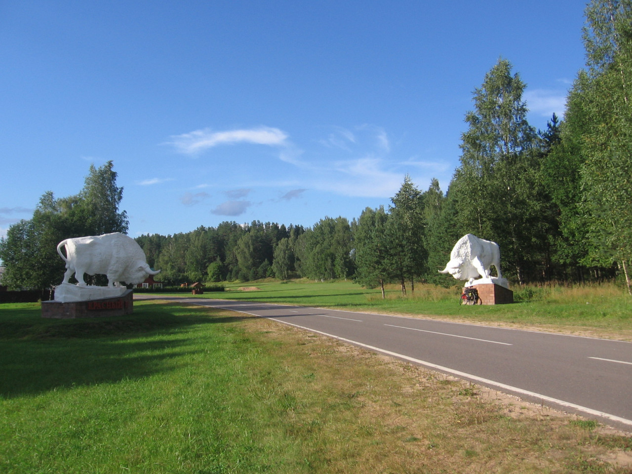 После озера подъем на горку и – разочарование. Слева примыкает главная дорога. Широкая, пыльная и изборожденная мелкими ямками. Ямки сплошные, что невозможно быстро разогнаться вниз и неудобно уверенно подниматься в гору. Также неожиданно я оказался спустя немного в цивилизации. Выехал вдруг на самый гладкий асфальт, какой только бывает. С двух сторон установлены гипсовые зубры…