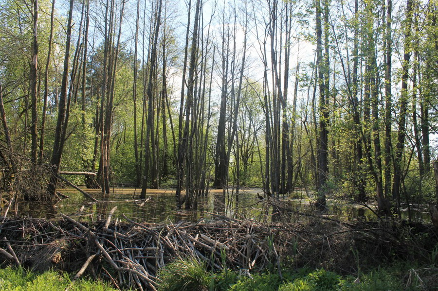 Затем нас ждала ночевка на озере вблизи дер. Халечино. Прокладывая маршрут, я не рассчитывал ни на что особенное: озеро и деревья есть да и ладно. Однако именно в этом месте в полной мере проявиласть мистическая составляющая нашего похода. На месте стоянки обнаружилась заброшенная деревня, рядом – произведение бобрового искусства, ночью – говорящие деревья. Таня Лазовская, которая еще вечером сумела произвести неизгладимое впечатление своим местом обитания в походе (самодельный гамак), поселилась на деревьях, вздумавших ночью (без ветра) поочередно скрипеть, переговариваясь друг с другом. Первоначально родилась версия, что деревья и изгнали жителей деревни из домов, впоследствии появилось и второе объяснение: души жителей переселились в деревья.