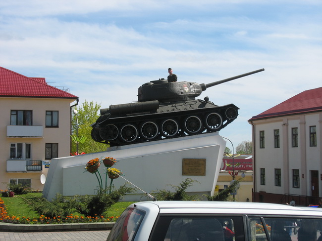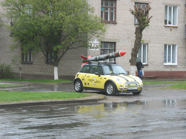 Тем временем график похода горел ярким пламенем. Санёк намекнула, что пора прекращать эти детские игры и ехать дальше. Она главная, мы не смели прекословить, и после часовой задержки устремились навстречу новым впечатлениям. День был пред-праздничный, страна готовилась праздновать день победы, и на одной из барановичских улиц мы не смогли проехать мимо маленького ракетоносца с трогательной надписью: «Спасибо за победу!»