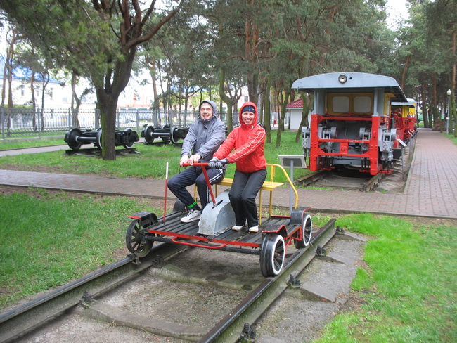 Выходить из тёплого красивого вокзала на холод и дождь хотелось не очень, но с нами была Санёк, а у Санька – график прохождения маршрута. Поэтому, приторочив под дождичком рюкзаки к багажникам, мы вырулили на старт. Далеко проехать нам не уда-лось. Оказалось, что путь наш лежит рядом с музеем подвижного состава БЧ. Музей под открытым небом. За металлической решёткой друг за дружкой стоят паровозы, вагоны, дрезины, платформы, снегоочистительные машины, бульдозеры, ездящие по рельсам и прочая, и прочая, прочая. Серёга (конечно же, Климович) сказал, что не может просто так проехать мимо чудес техники и должен всё это богатство осмотреть, несмотря на то, что этот музей не включен в программу. С этого момента программа похода и всё, что было с ним связано (погода, состав группы и пр.) начало трещать швам. Но мы этого ещё не зна-ли и поехали искать вход в музей. Нашли. На входе было написано, что суббота и воскре-сенье – выходной, и нам не светит. Начали просовывать фотоаппараты и морды лиц сквозь решётку, чтобы зафиксировать в мозгу и на электронных носителях стоящие за за-бором чудеса техники. Наше желание поближе познакомиться с историей родной желез-ной дороги настолько сильно сквозило в зажатых прутьями решётки мордах, что дежур-ный смотритель, несколько злоупотребляющий (в свободное от работы время), не устоял и, открыв навесной замок на запоре калитки, предложил нам пройти и осмотреть экспози-цию поближе. При этом он подсказал, в каком паровозе можно залезть в кабину машини-ста, как открывать паровозную топку и пр. Тут-то мы и оттянулись.