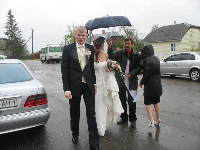 Нас они восприняли как нечто инородное и очень нежелательное. Делая вид, что нас вообще не существует, по мокрой траве они обошли стоящие поперёк дороги велоси-педы и, мочимые дождём, проследовали навстречу своему счастью. Шафер быстрым ша-гом подошёл к Серёге (К) и молча сунул ему в руки отцепную бутылку водки, даже не спросив у наших девчонок, не хотят ли они конфет.