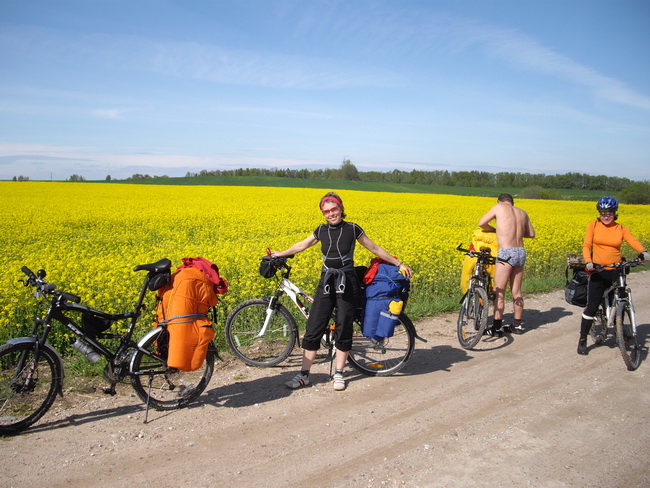 Находясь под впечатлением увиденного и услышанного, направили колёса свои в сторону Ружанской пущи, где предполагалась ночёвка. По пути попалось огромное рапсо-вое поле. Имея обострённое чувство прекрасного, мы не могли проехать мимо. Какая же это красота!!! Какие краски!!! Голубизна неба, нежная зелень листвы и молодой травы, яркая желтизна цветов рапса, теряющаяся в ней змейка полевой дороги… Мы не могли просто проехать мимо, не нанеся урона сельскому хозяйству!.