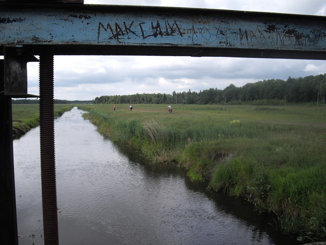 Дорог не бывает бесконечных, особенно у нас в регионе. Закончился лес, и начались луговые угодья. Мы свернули налево возле маленькой подслеповатой деревни Песчанка. Так было прямее всего. После катились по насыпи, которая пошла дальше вдоль канала сама собою. А дорога наша, которая ответвилась от той самой насыпи, закончилась тупиком. Согласно карте и JPS она имела продолжение, куда нам надо. Однако мост через Птичь оказался давно разрушен.На его месте из воды торчали только лишь истончившиеся от времени ослизненные сваи. Пришлось возвращаться назад.