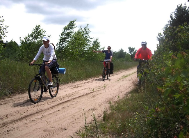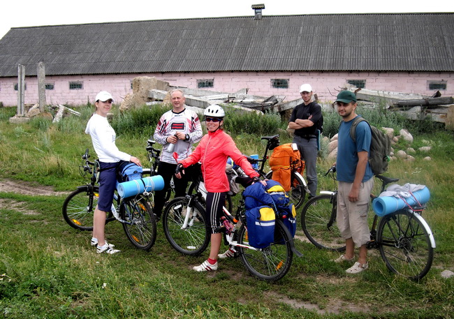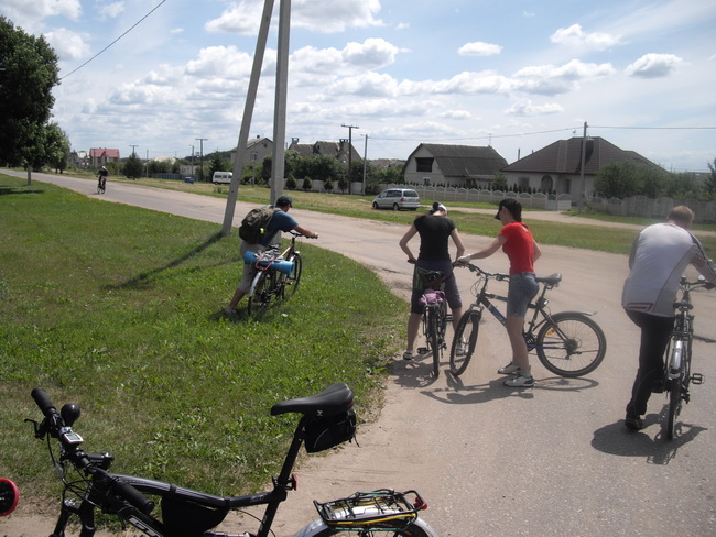 Возле деревни Сергеевичи встретили сочувствующих, прибывших из Минска на машине Форд бардового цвета: Стас (Глазов ученик, который пробуется для активного отдыха), и Ленина сестра Таня (тоже пробуется для активного отдыха). Их к активному звену отнести было нельзя, поскольку были они не на велосипедах, определили их, как экологический десант. Время рассчитано было верно. Ожидали они не более десяти минут на Т-образном перекрестке дороги. Таня с удовольствием сообщила, что когда они ехали, она держала раскрытую карту и указывала согласно ей, карте, куда и где сворачивать.