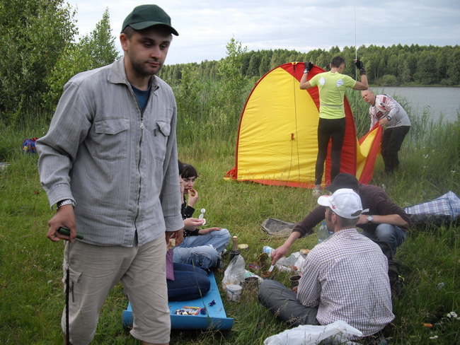 Озеро, на котором мы обосновались, вытянуто на несколько километров в длину, а в своем поперечнике имеет метров 200-300. Оно зеленое и уютное, только с южного полюса вид портит возвышающаяся водонапорная башня. Нет его ни на одной карте, поскольку возникла оно на месте выгребенного торфянника. Здесь на на старых картах даже обозначена ветка узкоколейной железной дороги. Не бывал я тут года с четыре. Небольшая свободная от леса полоска берега подверглась значительной экспансии растительности: берег подзарос кустарниками и высокотравьем. Но для лагеря нам места было предостаточно. Озеро это относится к одной из Глазовских точек, на нее я имею виды для выездов на мобильной бани на шасси 157-ого ЗИЛа (мы хоть и медленно работаем в этом направлении, но работаем). Была и сегодня мобильная баня Эдуарда Лимонова - "мобиба" в своеобразной штатно для этого предусмотренной палатке. Он принялся её сосредоточенно сооружать, то один, то другой ему в этом помогали. Много нервов попортила эта "мобиба" Лимонову..jpg)