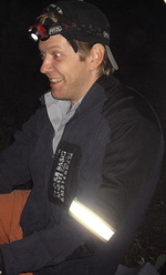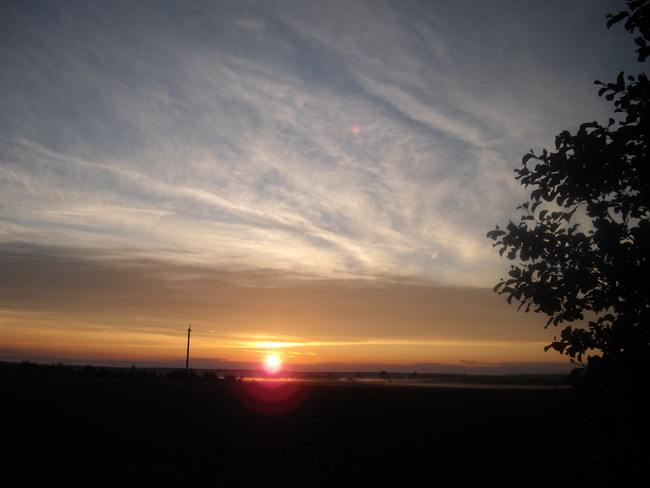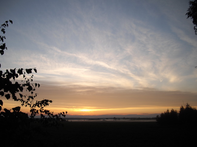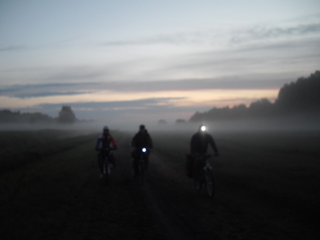 Лагерь стали разбивать, переехав поперек пойму реки и поднявшись уже в лесу на более высокое и ничем не примечательное место на краю вырубки. Коллектив собирался разрозненно. По прошествии чуть большего времени чем час, позвонил Сережа Климович, мол, полтора километра по лугу они уже проехали и никакого другого моста не видят. Пришлось ехать их встречать. Возле коров навязчиво лаяла собака. В еще не полной темноте из тумана проступали ничего не светящие лучики фонариков как бледные небольшие кружки, но вот фонарики стали ярче и с ними показались неестественные как-то здесь теперь четверо и на велосипедах, как темные поступательно и бесшумно движущиеся силуэты. С теми, что чуть не перевернулись на Эдиковом блайзере (сам Эдик, и Климовичи), был еще Витя К. Были они все в возбужденном настроении, потому что застали неимоверно необычный закат и еще перед этим такой дождь, который поливал очень мозаично, визуально видимыми полосами.