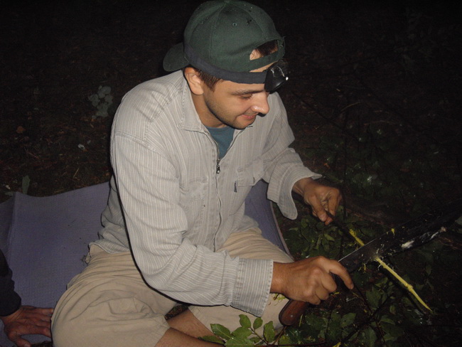 Прутья отругивались не ножом, а палашем Вити. Палаш этот или даже мачета мог конкурировать с топором - с двух ударов перерубалась ореховая жердь, милиметров 40 в поперечнике.
