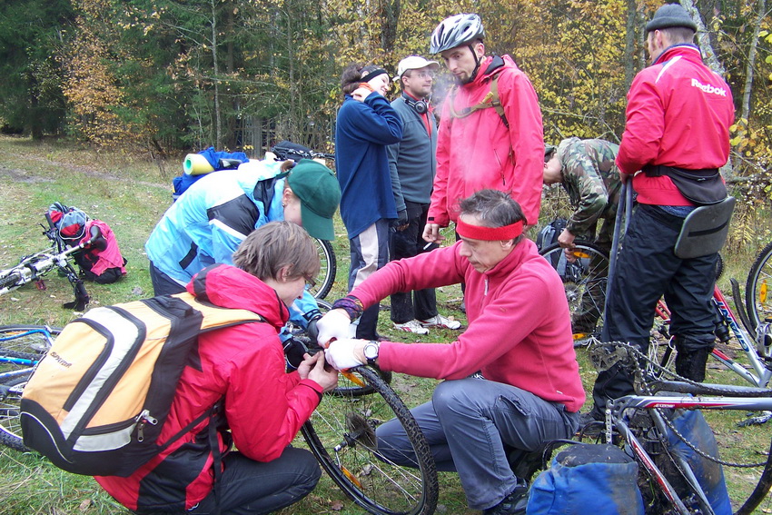 Славину камеру заклеили, Глазову просто поменяли на нулевую. Сосок с золотниковой системой не лез в отверстие обода под более узкий нипельный сосок. Методично раздраконивали отверстие. В общем спустя полчаса снова были уже на ходу.