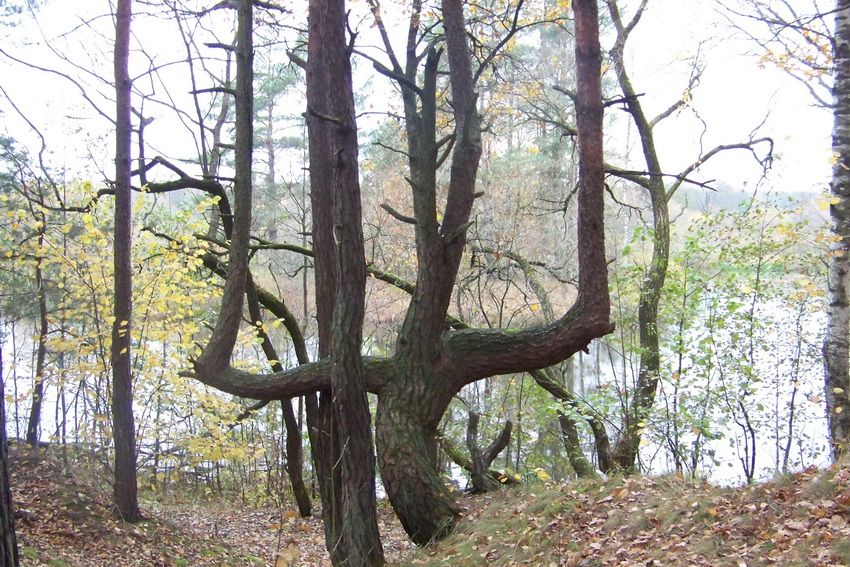 Собрались воедино у костра на поляне Нафрановича. Здесь Свислочь делает поворот направо, образуя у левого берега совершенно причудливую затоку с довольно прозрачной стоячей водой. В затоке правильной формы небольшой круглый остров. Он высокий, что растут сосны. Но приятен не только остров, да и сам берег. Здесь не замусоренный лес. Ежели чуть отойти, ровная травянистая полянка, еще дальше луг. В лесу шильда, свидетельствующая, что здесь место какого-то древнего городища. Кроме того растет мускулистая сосна. Её нижние ветви расходятся крестообразно, словно это согнутые в локтях руки или неровный трезубец.
