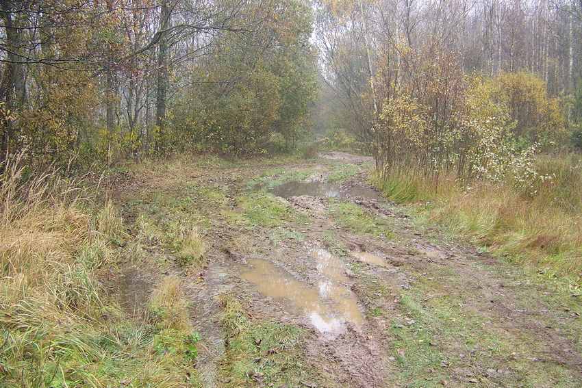 Поле перешло в колейную лесную дорогу. Не обошлось и здесь без обширных луж.