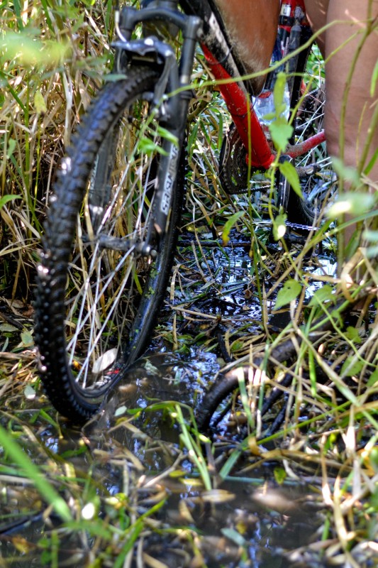 За хмызняком - пусть через слегка притопленный заливной луг с высокой травой и хлюпью саниметров 20. Погружать велосумки на велики смысла не было: местами кочки и грязь делали дорожку не самой банальной. Потому велики перегоняли отдельно, грузы - отдельно. Впрочем, всё проходибельно и нагрузка вполне лайтовая.