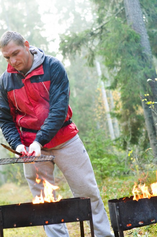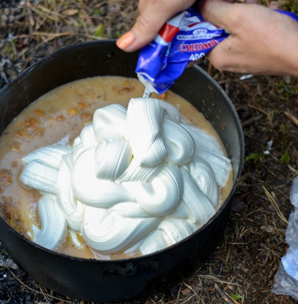 Поутру грибов особо обнаружено не было, зато было обнаружено невероятное количество сметанно-майонезных запасов (послушно взятых участниками согласно глазовской инструкции). Таня Лазовская по такому случаю забабахала целый котелок обалденного сливочного соуса. Пошёл с макаронами на “ура”.