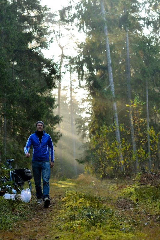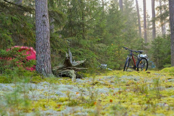 Утро встретило обнимающими туманами. А поскольку лес был вдобавок устелен мягкой подушкой мхов, то вкупе с палатками - разноцветными домиками хоббитов и велосипедов, прислонённых к соснам и седоватым елям, - выглядело это все, конечно, совершенно сказочно. Место стоянки, скажем сразу, райское.