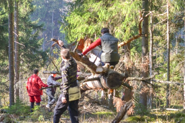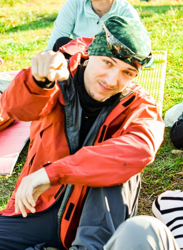 Буквально в 10 метрах от костра лежало живописнейшее поваленное дерево. Ветви его уже оголились и превратились в достопримечательность лесного дизайна. Любители прекрасного настояли, что коллективное фото должно произойти непременно на нём! Можно разместиться на стволе и толстых ветвях, получится магадановский каскад и октябрьское счастье композиционного эстета. Рванули дружно атаковать несчастное дерево. Однако будучи промассажированным десяткой пар ног древо быстро пришло в себя и с хрустом изобразило “а полетать не хотите ли?!”. Впрочем, обошлось без жертв, и фоткались всё равно на нём, хоть и обломанном).