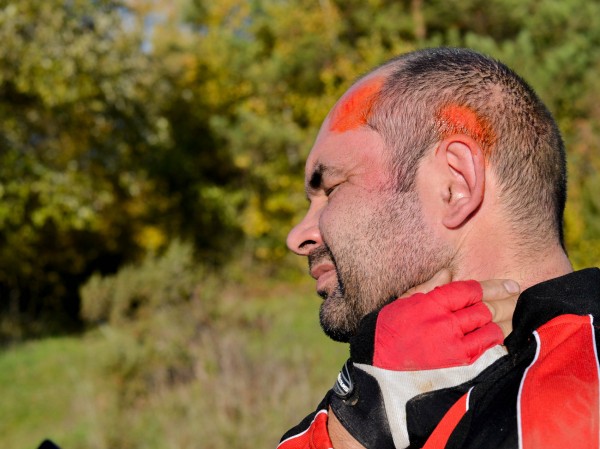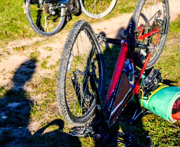 Вскоре на поляну прикатила-таки жертва полётов (я же обещала, что о полётах будет). Такое дело: Миша Мендибеков тоже ехал только на передних тормозах. На спуске перед ним кто-то тормознул, и Миша совершил незапланированную пикировку на голову. Тесанулся и ударился. Ну и велик, соответственно, с качественной “восьмёркой”.