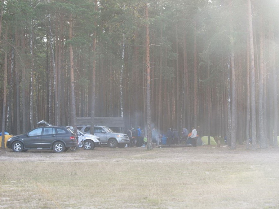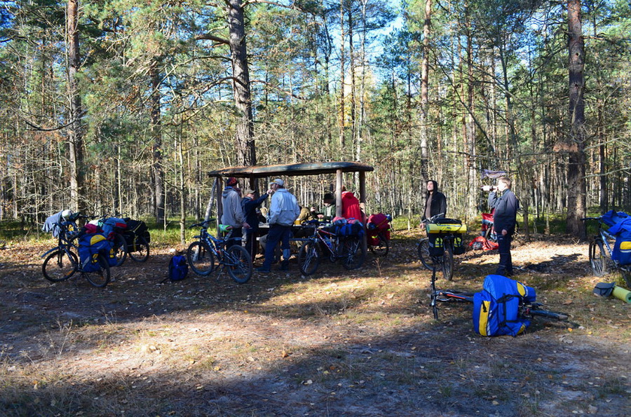 Поскольку везти велик по песку, не едя на нем, порядком напрягало, все старались ехать до последнего, перенапрягая непривычные к нагрузкам мышцы. Мышцы возмущались, ругались и отказывались сокращаться. Во время этого похода я научилась ловко ехать по песку и даже в это время дремать. Тело как-то перешло в автономный режим - ноги сами крутили педали, руки сами рулили, голова дремала и лениво обозревала окрестности. Даже в местах особо подлого слоя песка руки сами как-то выруливали, не трогая голову совсем. Правда в конце первого дня, почти на финише, они сказали - "а нафиг надо" и отказались реагировать. Велик стал колом, и мы медленно, как куль, повалились на бок. Приземление было мягким, на обочине был глубокий слой песка. Бог мой, как же хорошо лежать. Подошел Сергей Волосачз оказывать помощь, и я попросила у него разрешения еще полежать. Он не разрешил (садист), поднял меня вместе с великом и заставил ехать. Но тут о радость - метров через 50 обнаружились Лена и Сергей Климовичи - они съездили в Осиповичи за новой цепью и снова присоединились к нам. Помимо радости, которую они нам доставили своим возвращением, они сделали еще 2 очень полезных дела: подкормили нас и устроили небольшой привальчик, во время которого удалось собрать оставшиеся силы. А тут еще Эдик забрал у меня рюкзак на свой квадроцикл - о, радость, я поехала дальше налегке, и без особых приключений докатила до лагеря.