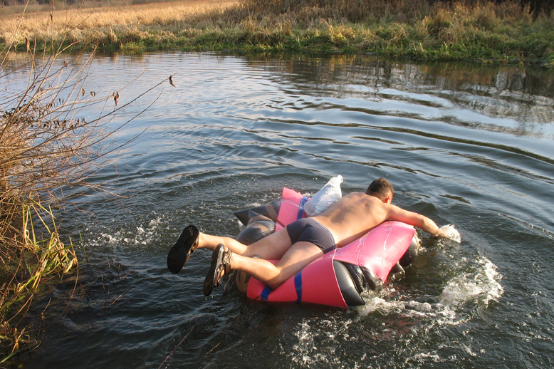Ехалось нормально. Впереди ждала переправа. Со второй попытки выбрали место. В первом было сильное течение и не было выхода в суетный мир. Плот был основан на Катином инстинкте самосохранения, то бишь на плавательном круге, который оброс теми же пакетами. Думаю, в будущем, эта тема разовьется в надувных женщин, безусловно. Вначале запускали Волосача — он был похож на воздушного змея на пенсии, который все еще питает иллюзии на свой счет. Береговой пинг-понг (словесный и предметный) набирал обороты. Этакая оргия: женщины охотно раздевались, шампанское лилось рекой.