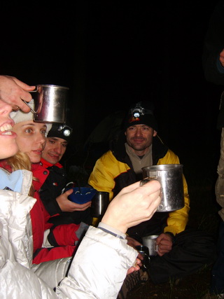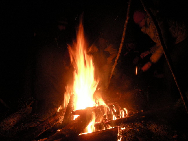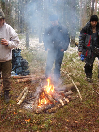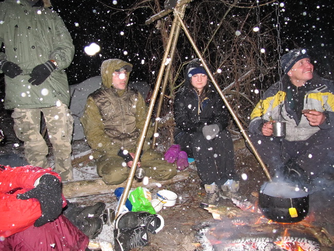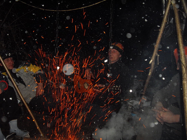 Потом я сушился, сидя близко к костру с закасанными штанами, как в шортах. Как обычно, у костра пели песни и бухали. Товарищ Полковник, как только пришли, забрался в палатку, и оттуда несколько часов доносился храп. Однако, говорят, в итоге оттуда "выплыл" и присоединился к участникам турнира. Я сам посидел недолго, поскольку за день так напробовался различных алкогольных компотов, что было теперь мне одна дорога - двадцать шагов до палатки. Не видел я уже и как пошел густой снег, ложившийся почти при безветрии хлопьями и как навстречу этим хлопьям снизу вверх костер взметал снопы искр.