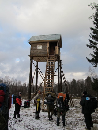 Потом еще шли по той же самой просеке, которая снова стала четко выраженной и суше. Глазу показалось, что это всё же не та, а нужно идти по параллельной, которая севернее. Нашли и параллельную, которая севернее. Так вскоре мы вышли на другую уже вырубку. Внимание привлек здесь охотничий домик, стоящий на жердях. В домике стеклопакеты, топчан и даже буржуйка. Стены обиты вагонкой. Лестница наверх. Домик этот выглядел ново, уютно и представительно. Едва ли надолго он сохраниться: у нас не как на севере, как пить дать - пошакалят какие-нибудь мародеры. Хоть им сюда и далековато ходить.