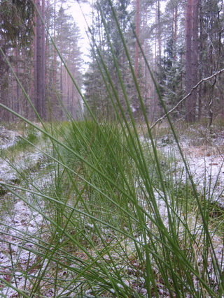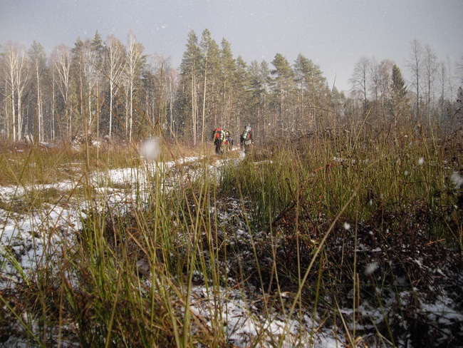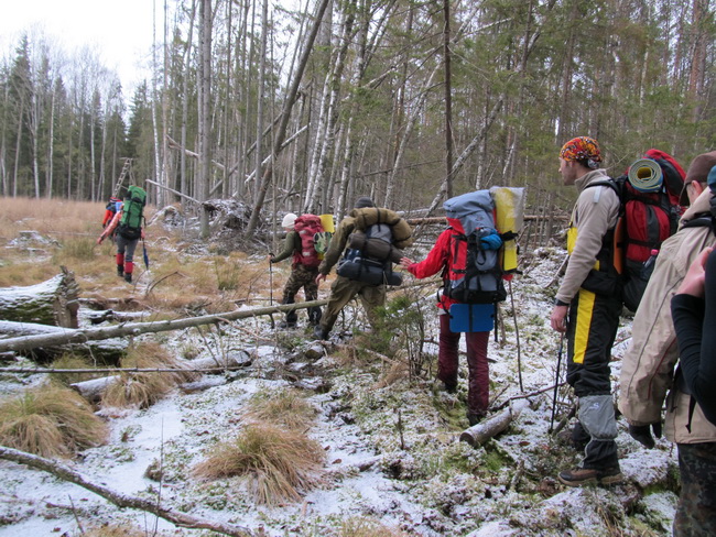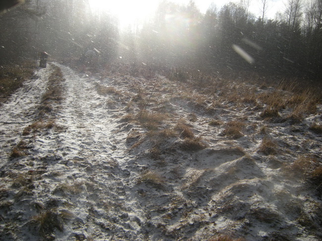 Шли развернутым строем по просеке с направлением в 255 градусов. Сначала был по центру прорыт противопожарный коллектор, поросший рослой вечнозеленой травой и с обнаженными местами кореньями деревьев. Просека быстро стала деградировать: появились переваленные поперек деревья, а еще дальше она вышла на край заболоченной вырубки. Псевдолыжно-разношерстная бригада по темпу движения быстро ушудшилась. Заболоченную вырубку пытались обойти по краю. Довольно успешно, но сильно растягиваясь, когда уже и не видны сзади идущие и нужно перекрикиваться. Снега нет, а значит и следов нет. Мороз какой-то да был. Болотные лужи сковал хрупкий ледок, который держал через раз.