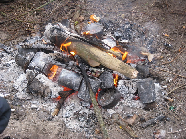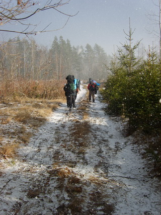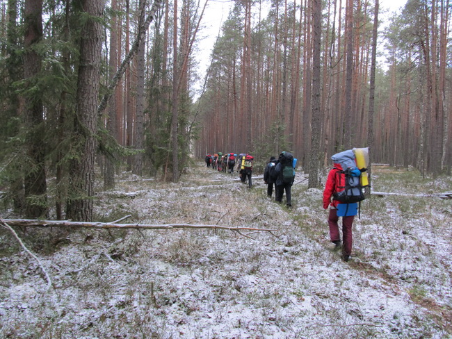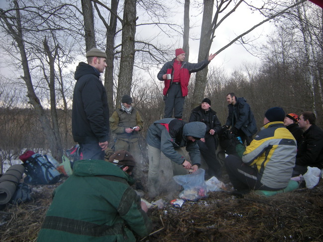 Поход планировалось начать двумя самостоятельными группами с последующим рандеву и конвергенцией. Я, Глаз, предварительно решил съездить в нужный лес в разведку. За 13 часов прошел 35 километров, нашел олений рог и даже видел несколько косяков косуль. Инспекция показала несостоятельность попытки идти двумя группами, поскольку маршрут с севера на юг для второй группы был расценен, как неадекватный для имеющихся временных рамок. Пошли одним составом. Так в те выходные в том лесу можно было видеть двигающуюся гуськом шоблу в 20 человек
