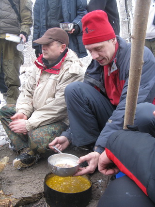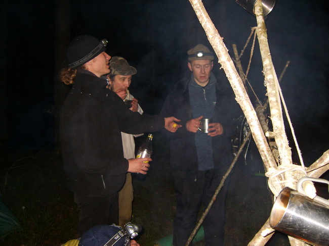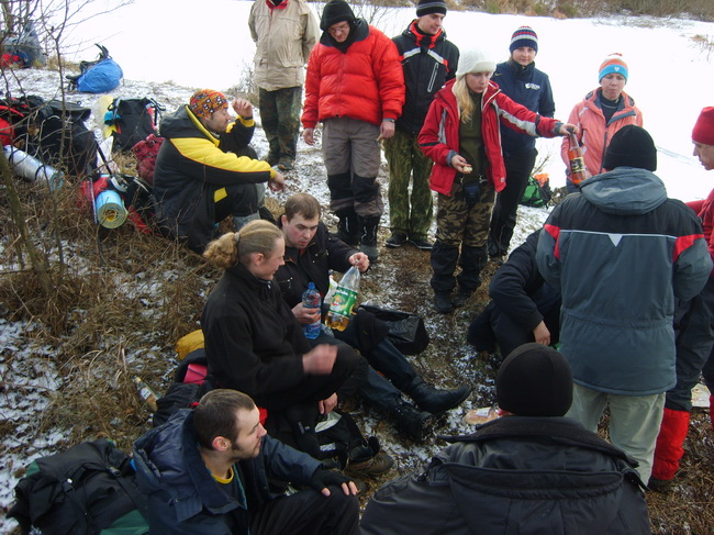 Могилевское звено и Максим из Орши поехали в Осиповичи с прибывшим из Минска Славой. Я, Глаз, с Вовой Г. с работы, тоже прибывшим из Минска, поехали забирать из деревни Французская Гребля Стаса с Товарищем Полковником. Остальные 14 человек в Минск на прибывшем оттуда по предварительному согласованию бусе. Дорогу в эту самую Французскую Греблю в темноте по карте искать было неудобно: много перекрестков, что не поймешь, где нам и куда. Но справились. В конце деревни на дороге стояли Стас с Полковником, которые из леса от костра пришли сюда слишком рано и уже давно замерзли.