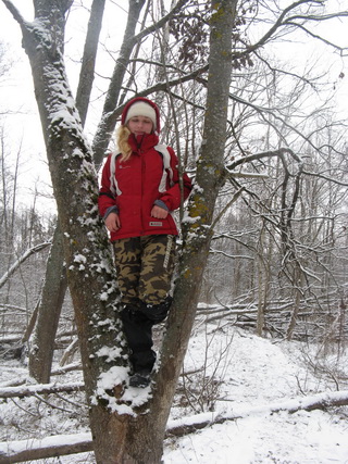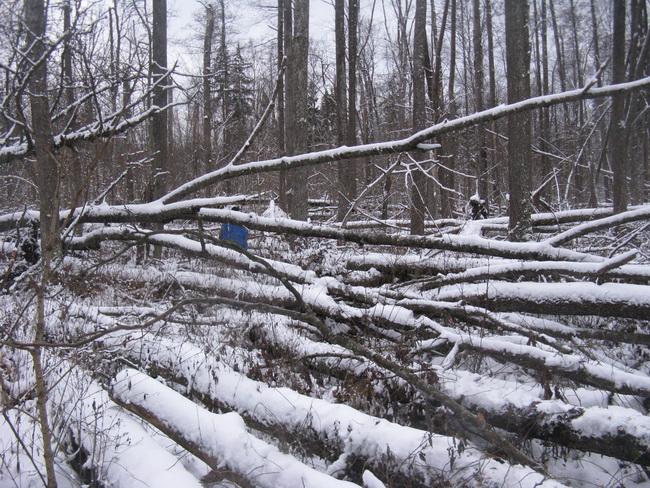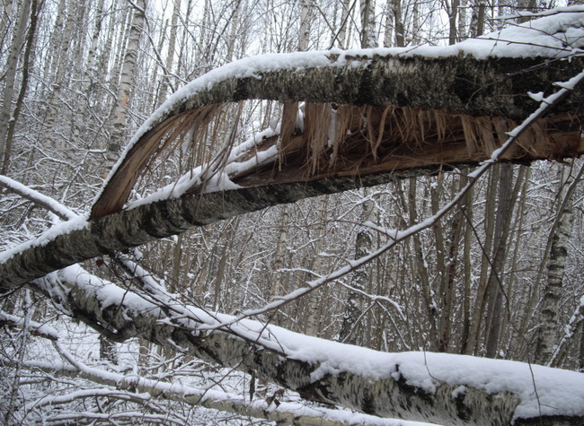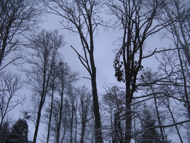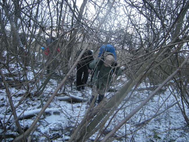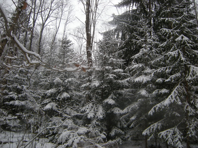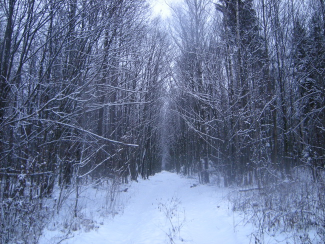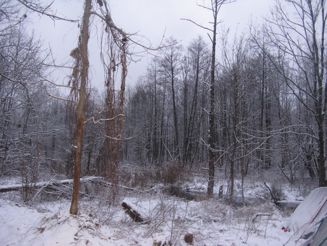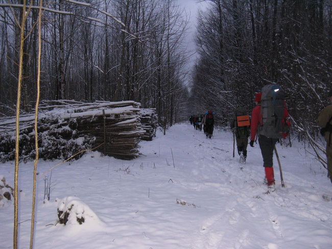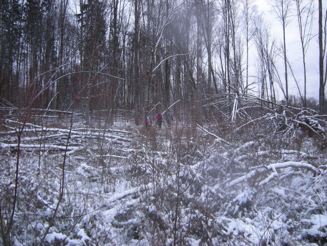 Лесная дорожка вскоре вывела нас на просеку, где идет газопровод. Какое-то время шли по ней, но она не только шла на юг, но и делала акцент к востоку. Нам было нужно напротив, на юго-запад. Снова стали срезать по пересеченке, вышли на вырубку, потом к завалам и выворотням, что не иначе, как во время сильного урагана положил ветер. Темнеть начало, когда шли по просекам. Лес был в основном лиственный, не сверхгустой, однако влажный и мрачный. Просеки были похожи на аллеи в ботаническом саду, но только более плотные и интимные. Направления просек были не совсем выгодные: или на юг или на запад. Так что получалось идти или так или так. Под ногами хрустел снежок, темнело. Лес становился дремучее и неухоженнее. Но местами видно было: что-то пилили и расчищали.