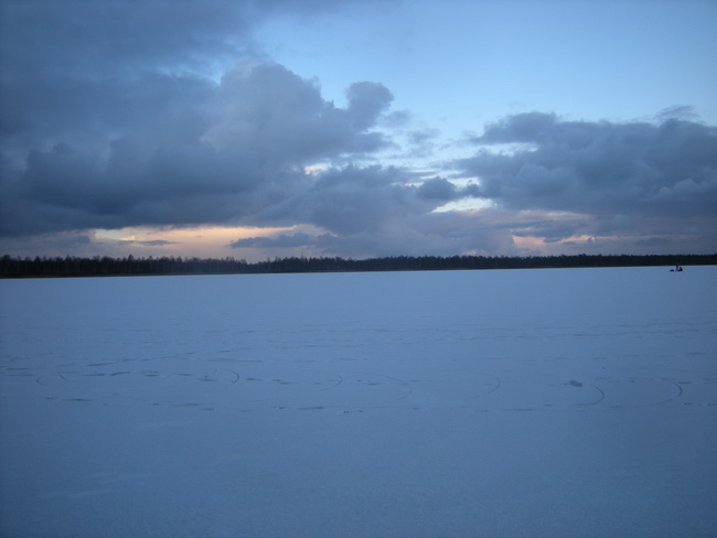 Кадр просился как нельзя кстати вот сечас. Этот первый лед на лесном озере и особенно хорошо сочетаюющееся с этим вечернее небо. Тем более, погода именно теперь стала улучшаться. Ветер был слабый. Тем не менее, стала разрываться косматая облачность и обнажаться прозрачное небо, которое на юго-западном горизонте розовело.
