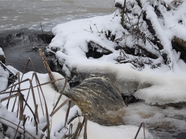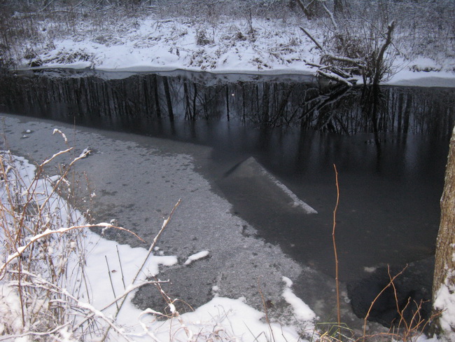 Смеркалось. Мы шли вдоль кромки лиственного заболоченного леса по заросшему высокотравьем выгону, на котором посадили молодой лес. Лочинский канал переходили по заваленному поперек оьховому стволу, который был скользок из-за снежной присыпки. Я прешел на противоположный берег и уселся в партере: