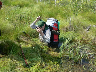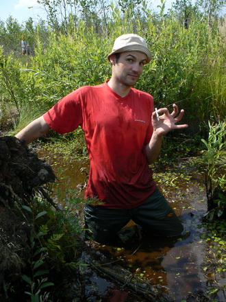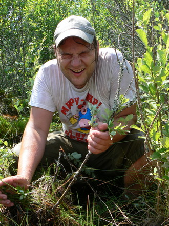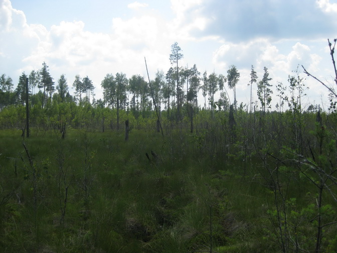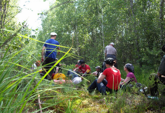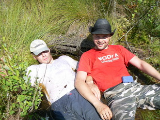 Время тогда было адское. Пишется повествование это уже спустя неделю, когда отпустила жара, когда жить стало веселее и утихла досада на неудачливую погоду. Но в то воскресенье плавились мозги. Они плавились даже не смотря на то, что шапку и майку я старался мочить в каждой луже. Мы пересекали обширное мшистое болото, где много сил расходуется на этот мох, в котором утопает нога. Сверху жарило солнце. Вокруг зыбкие клюквенные кочки и худосочные сосенки не дающие никакой тени. Подарком воистину был вновь начавшийся тенистый лес да еще и с черникой. Мы снова лежали в какой-то уже более холодной луже и жадно ели ягоды. Моя белая кепка сделалась к тому времени серой, то же и майка.