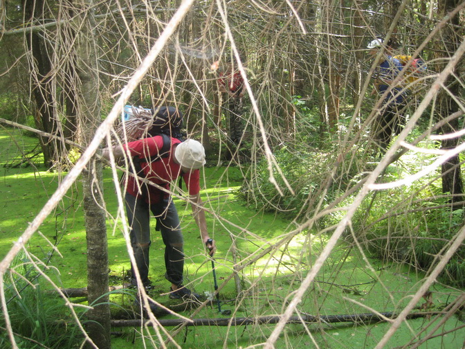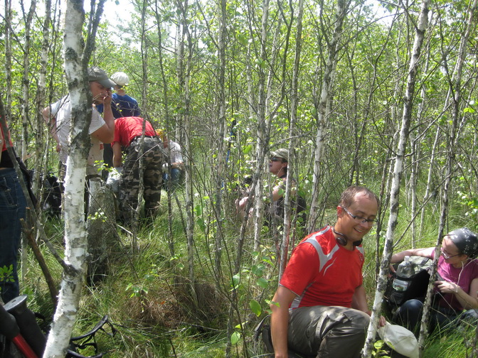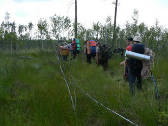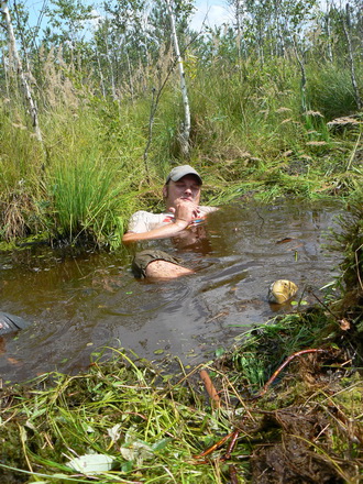 Противопожарный водоем оказалось, что обитаем рыбой. Скорее всего, это мелкий карась. Должна рыба жить, если подобные сажалки не пересыхают и не промерзают до дна. В тени сосен первое время было сносно. Вышли в скором, и сразу же сдохли. Воздух был раскаленным, а солнце испепеляющим. Все красоты начавшегося болота на этом пекле становились не заметны. Солнце это еще туда сюда, но влажность у нас конечно - это ад. Начались каналы, переросшие растительностью и торфянисто грязные. Никого не смущало падать в этот горячий мох, чтобы как-то намокнуть и хоть какое-то время облегчить это душное марево. Почти полтора десятка человек вскоре были обнаружены оводами. Они были как никогда назойливы, постоянно кусали за всякие открытые участки тела, которых в такую погоду хватало.