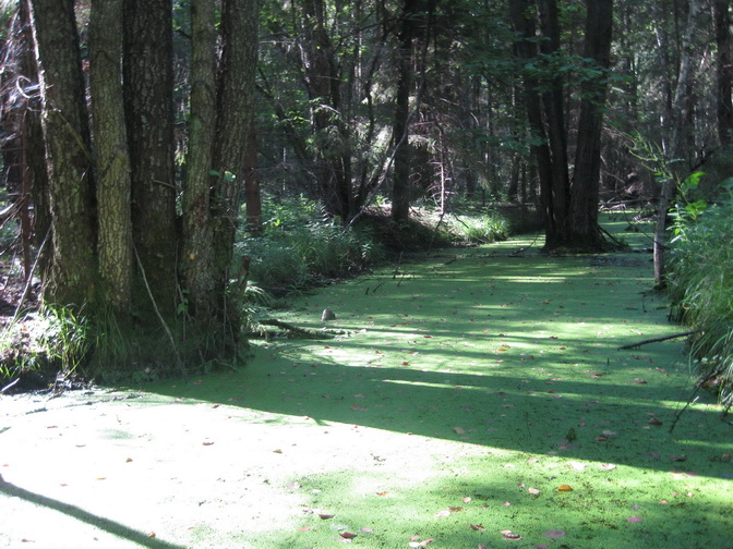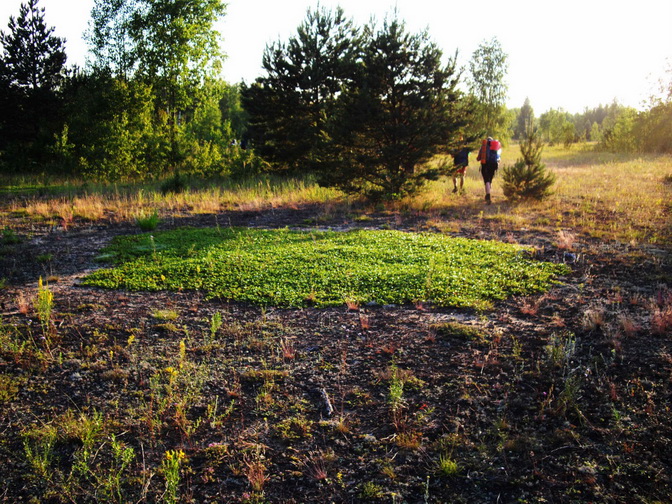 Вытекающий из Гремячего озера, он же Протасевичский канал здесь, где мы его переходили, течения не имел. Под тенистым навесом деревьев он сплошь был выполнен ряской, коренья елей были покрыты обильно мхами. Солнце пробивалось сюда едва-едва. Атмосфера была сказочной и старинной, как на иллюстрациях к стихам поэта Баратынского. Форсировать канал, как это делали два года назад по маю, не пришлось, нашелся естественный переход. Через несколько километров пересеченки повстречали дорогу, идущую на юго-восток. По ней и пошли. Так оказались на одиноком и заброшенном полигоне. По полигону идти не мудрено. Сухой паесчанник. Кверху расходятся веером лапы кустов либо растет аккуратный и коренастый молодой сосонник. Просто идешь, будто в парке, по этому редколесью, а в перпендикулярных направлениях нарезаны дорожки.