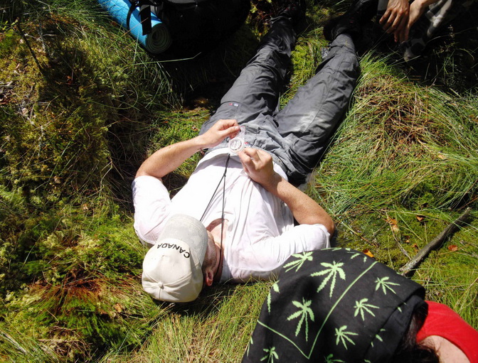 Часть утра была сносной. Солнце не пробивалось в наш уютный и тенистый лагерь. Мы сжигали мусор. За вечер как всегда напили уйму водочных бутылок. Собирали вещи. Глаз потерял компас. Остальные утешали, что есть солнце, GPS, да еще у кого в часах, у кого в кружке, у кого еще где сувенирный компас. Компас нашелся в кармане рюкзака уже после того, как я его проверял. Нашла Таня.