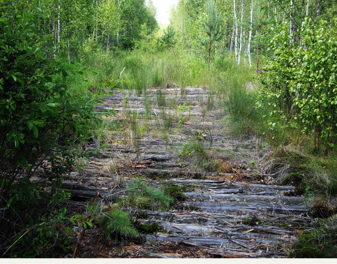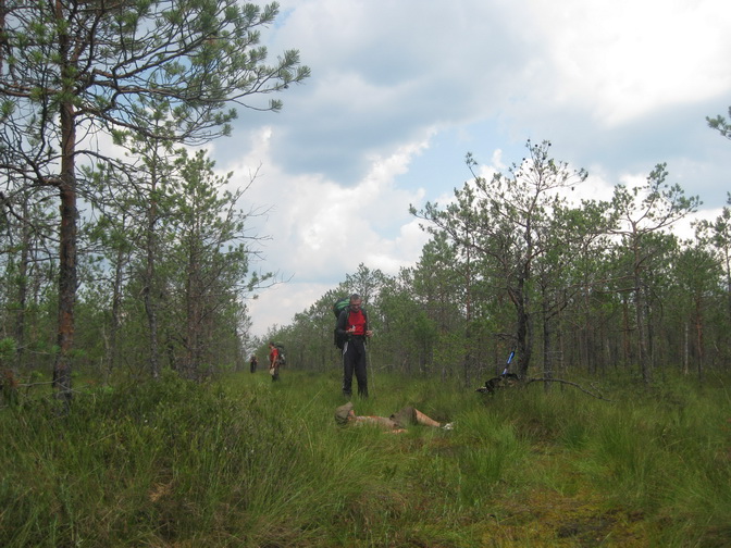 Шли на солнце. Старались 220 градусов. Интуитивно заносило в западную сторону. Каждый час нужно еще делать поправку градусов на 15. Оно ведь, солнце то смещается. Шли довольно быстро. Местность живописная. Пересекли в болоте одну даже просеку вымощенную бревнами. Пошлый раз таковой я что-то не помню.