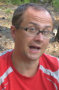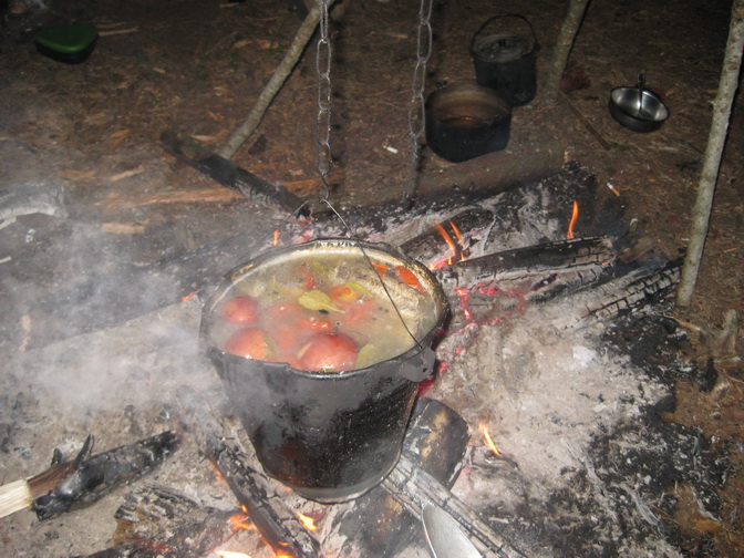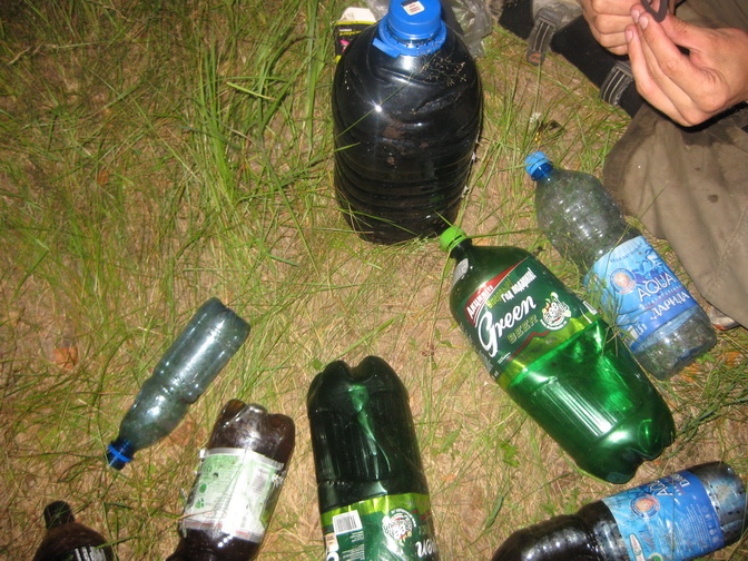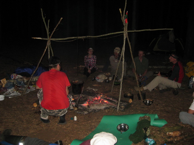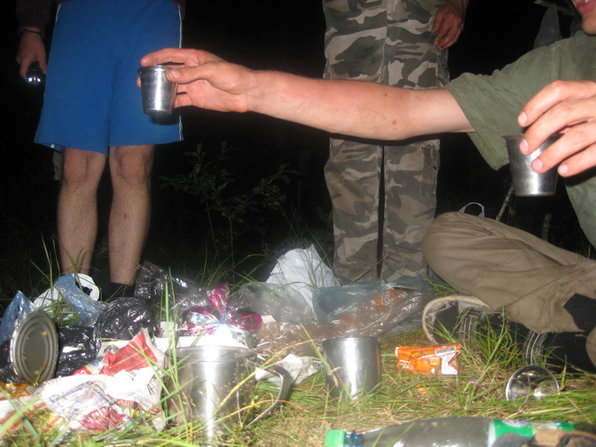 Снова мы шли, как и два года назад, 220 градусным азимутом. То было все да не то. Даже совсем по другому. Этот маршрут два раза одинаково повторить нельзя. К вечеру ближе стало очевидно, что без воды нам кранты. Где-то здесь теперь вот должен окончиться полигон. За ним будет понижение и болотце. GPS утверждал, что находимся мы в предписанном месте. Но оно было не то, что в прошлый раз. Тем не менее закономерно шло вниз понижение, где и были обнаружены грязные лужи. Стали разворачиваться лагерем. Костер был сегодня примитивен и за ним мало следили, разве пока кипятится вода. Воду кипятили с пристрастием. Цветность добытой воды была чернильной - отталкивающей от употребления, но жажда и потребность пересиливали. Еще раз про Уголок Шалуна. За месяц был выделен специальный человек, коий приготовил как раз для этих целей фильтр и его даже испытал. Позвонил он вчера, когда шли уже к месту вдоль полотна железной дороги: извиняйте, к нам без предупреждения приехала в гости двоюродная бабушка из Удмуртии. Стемнело. Без света чай из фиолетовой воды пился лучше. Особенно хорошо, что добавили туда найденного по дороге чабреца. Угадывался по крайней мере его аромат.