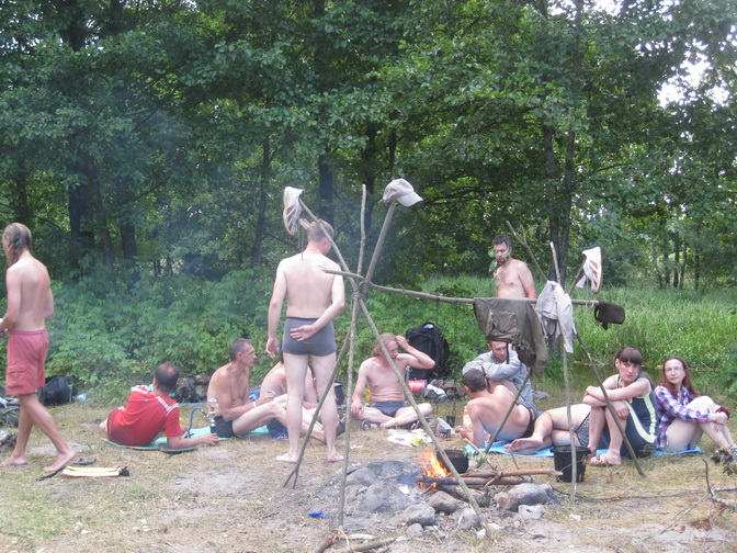 Было 22 соскочило 9 или 10, двое добавилось. Игорь, он же Пузо, пока жена в роддоме, чтобы ускорить ожидание, выбрался с нами на один вечер, просто водки попить, а на следующий день  собирался обратно. Также и Таня сестра Лены, но только без водки попить (логики не вижу). Оба изменили планы и пошли с нами в походную часть похода. Разумеется, вещи никакие не требовались. Еды хватало, да и какая на этой жарище еда.
