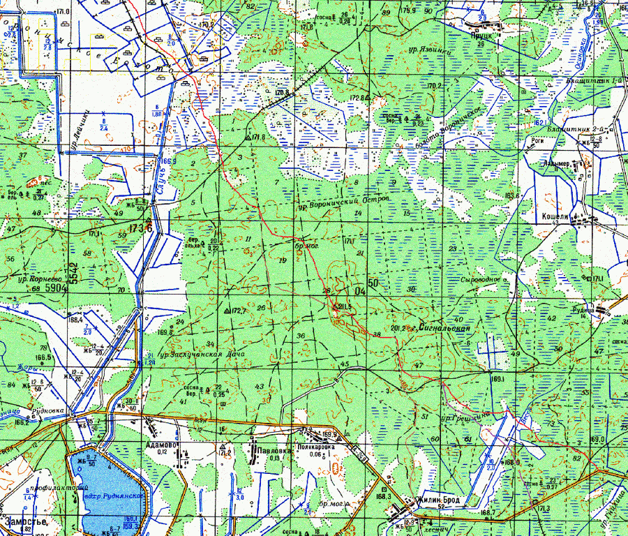 С трепетом взирал я на крохотное серое пятнышко треугольной формы, затерявшееся среди зелёного моря лесного массива. Теперь вышка была от меня как никогда далеко. Масла в огонь добавляла издевательская подпись под фотоснимкам на карте про весёлых людишек под тригопунктом. «Эх, Киса, Киса, мы чужие на этом празднике жизни», - вспомнилась классика. Утешало то, что, согласно спутниковому снимку, от деревни Поликаровка на Осиповичской трассе идти было всего около 3-х км и всё по прямой просеке. Достигнув жёлтой поляны-проплешины, следовало пройти по перпендикулярной просеке ещё около 500 м на восток. А там должна быть видна вышка. Я в мечтах уже видел тригопункт из-за деревьев. В принципе, я решил, что смогу дойти самостоятельно, если в это время будет ещё светло. Дело оставалось за сущей чепухой – дотемна как-то добраться до этой самой Поликаровки за 90 км от Минска. Перед сном я решил подстраховаться второй соломинкой и позвонил своему другу Паше, который неоднократно выручал меня в решении сложной задачи по быстрому перемещению из пункта А в пункт Б. Правда, сейчас речь шла о десятикратном расстоянии. Но оказалось, что беспокоиться было не о чем – друг не отвечал. Вся надежда оставалась на Витеньку Калину. Засыпая, я грезил этим тригопунктом.