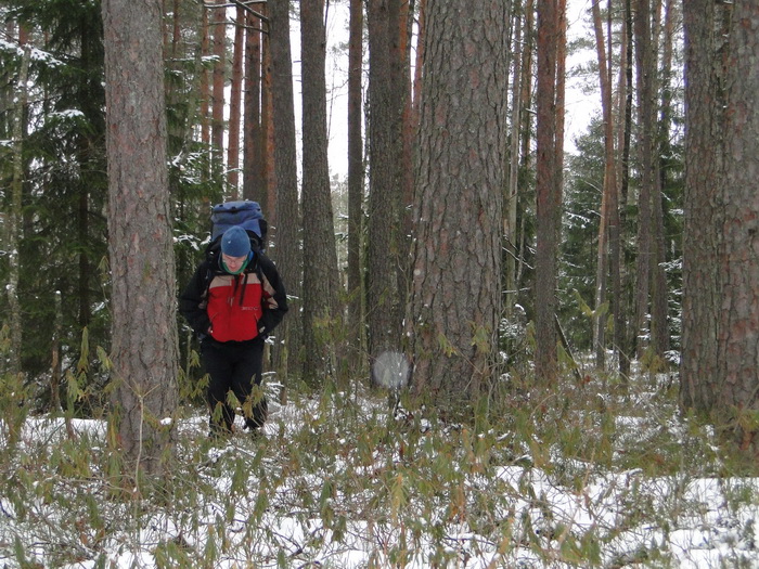 Утро выдалось жутким. Будильник прозвенел в 650 и встал я с большим трудом. Скрутив спальник и собрав рюкзак, я вскоре покинул гостеприимную палатку Кости Минкевича и пошел в гордом одиночестве в лес. На фоне черного неба виднелось зарево не то от воинской части не то от ЛТП. Вышка смотрелась величественно и мрачно. Мне нужно было от вышки на юг, но пришлось взять западнее и по следам выйти на просеку, а уж по ней забирать южнее. Налобный фонарик, одолженный мне Костей Минкевичем, скупо выхватывал дорогу. За ночь припорошило снежной крупой старые следы, но они были видны еще довольно таки отчетливо.