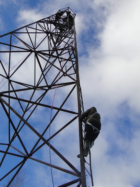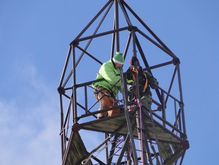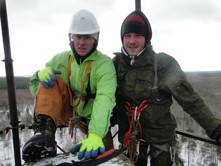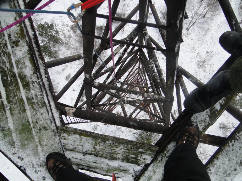 На работе я лазил и на 60 метров, а здесь в два раза меньше. Но всё равно лишние внимание не помешает. На верхушке я старался не становиться на доски, которые могли быть гнилыми, а держался большей у металлоконструкций.