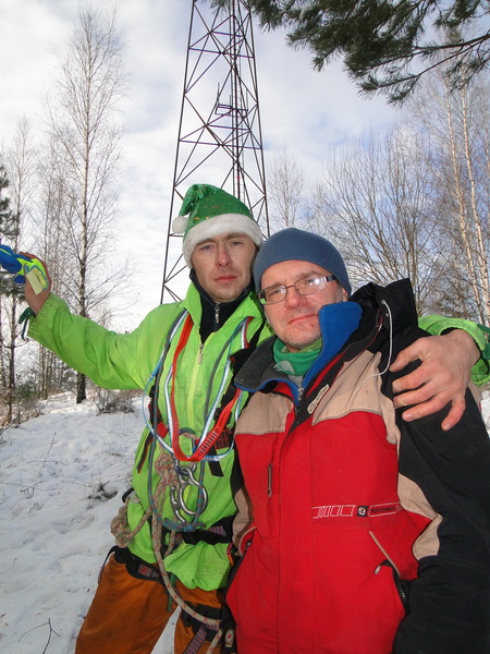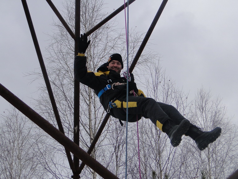 Тем временем из нижнего лагеря по направлению к вышке выдвинулись люди с верёвками на плечах. Во главе шёл дядя Борис. В скором времени тригопункт стал похож на новогоднюю ёлку, увешанную верёвками, как гирляндами. Одна верёвка шла вдоль гнутой лестницы вышки через промежуточные станции. Она служила в качестве страховочной при подъёме по лестнице. Другая – дюльферная – была принайтована к одной из поперечных балок посередине самой верхней смотровой площадки и розовой змеёй спускалась к середине воображаемого треугольника в основании вышки. Была и третья. Ею заведовал дядя Борис и называл судейской страховкой. К тому времени распогодилось. Низкое зимнее солнце выглядывало из-за редких облаков. Уже S.klim и Смирнов успели подняться на самый верх и спуститься, как к тригопунту вальяжной походкой подошёл Глаз в полной аммуниции. Быстро провесили небольшой тренировочный участок. Он начинался от двух берёзок метрах в 10 от вышки.