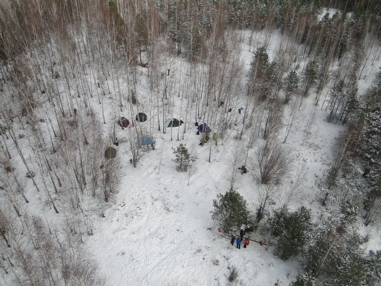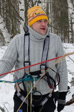 Наконец, все желающие прошли тренировочный участок по нескольку раз. Часть людей ушла на алкотрэш, а те, кто жаждал острых ощущений, поднимались на вышку по лестнице, страхуясь жумаром, и спускались с 28 метров по дюльферной верёвке. Вообще-то я панически боюсь высоты, но тут меня задавила жаба за потраченные на снаряжение немалые деньги, и я полез наверх. Чем выше, тем сильнее становился пронизывающий до костей ветер. Наверху уже обжился Лёша Басков и чувствовал себя, как дома. «А чем ты страховаться будешь?» - спросил он меня. Тут я с ужасом обнаружил, что, стремясь разгрузить себя для подъёма вверх, снял карабин со страховочного уса. У меня был только тонкий репик-шестёрка А. Бая, который я выпросил взамен купленной мною по совету Глаза, абсолютно непригодной на наших верёвках толстой макаронины-восьмёрки. «Вот всё, что у меня есть», - я обречённо протянул Баскову пёстрый Баевский репик, по цветовой гамме напоминающий знаменитую шапку Русьянова. «Давай сюда. Конечно, если что, он тебя не выдержит, но пойдёт», - успокоил меня Лёша. Я судорожно вцепился в перила, боясь сделать лишнее движение. Ветер налетал мощными холодными порывами, нагоняя страху. Басков, как мог, подбадривал меня, изо всех сил ударяя ногой по гнилым доскам площадки. Под ногами были деревья, людишки, палатки, снег. До  горизонта море леса, лоскутами хвойного и серо-лысого лиственного.