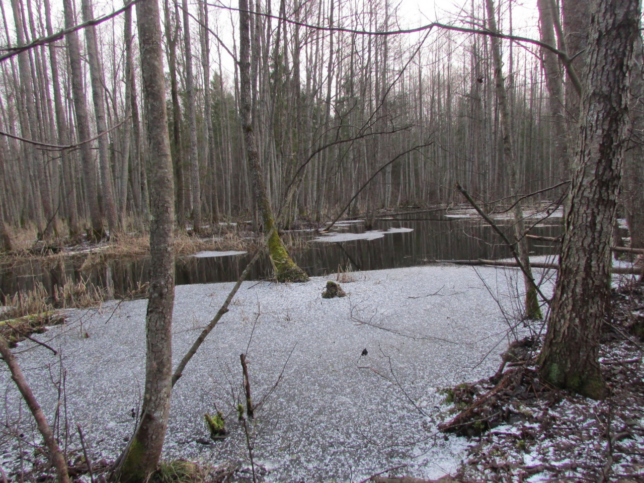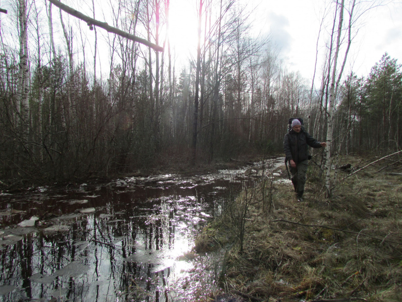 Местность на этой финишной прямой опять стала понижаться. Всё больше и больше луж стало появляться на дороге, к тому же оказались они ещё и в лесу, да не просто какие-нибудь там лужи, а самые что ни на есть настоящие разливы между деревьями. В них ослепительно сверкали подсвеченные Солнцем облака. Вскоре туристы вышли к весело бурлящему безымянному ручью – левому притоку Бродни – во многих местах засыпанному валежником и оттого натворившего в лесу столько мокрых дел. Через рахитичное на вид русло были переброшены жерди. Однако, инженерные войска, наладившие когда-то эту переправу, не учли сезонное вздутие русла, и теперь жерди, не доходя добрых двух метров до берега, вальяжно плавали на воде, действительно, как самые настоящие понтоны. Да и ручей, конечно же, оказался совсем не рахитичным, а взял, да и по колено искупал Пузочёса, отомстив, таким образом, за недоверие. Дальше Пузо уже не столько топал, а, скорей уж, больше шлёпал по дороге, но всё так же весело и бодро.