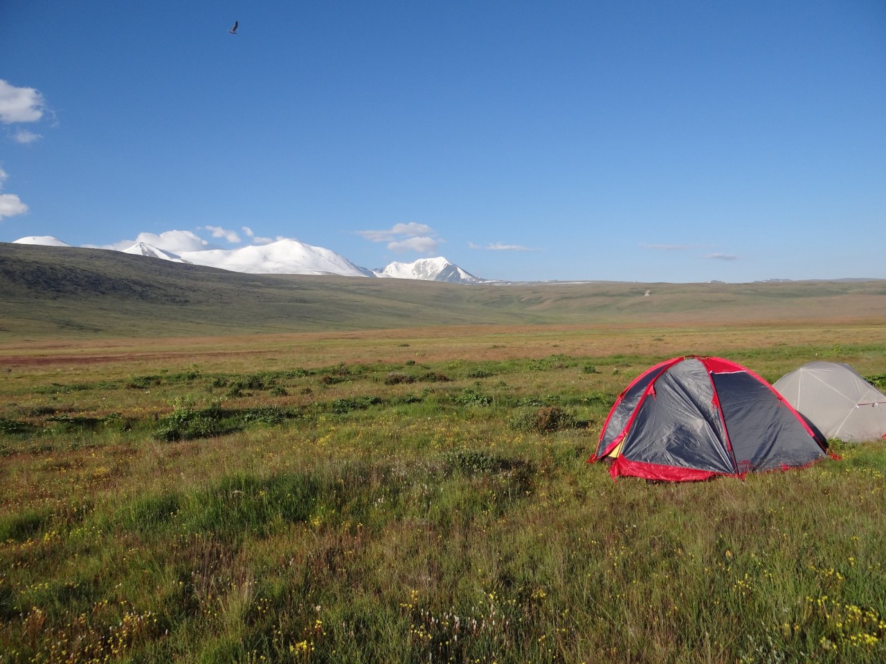 Где конкретно нас выгружать, про это не подумали. Андрей молчал, но чувствовалось, что хотел бы от нас побыстрее избавиться. Глаз и местные жители пребывали в состоянии алкогольного опьянения. Поиск транспорта на Плато Укок к началу маршрута рационально было отложить до завтра, когда обе стороны протрезвеют. Собственно, в голых, без растительности (флора представлена здесь невысокой и негустой травой) окрестностях усматривалось несколько озер. Андрея отпустили. Забирать нас договорились здесь же. За обратную дорогу пришлось заплатить вперед. На берегу ближайшего озера и разбили палатки.
