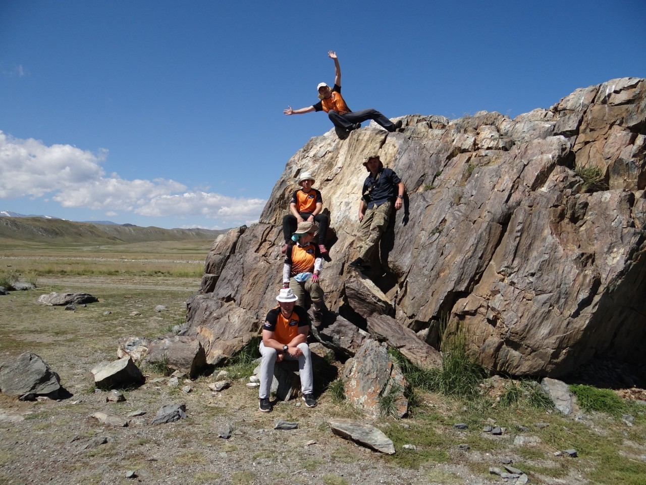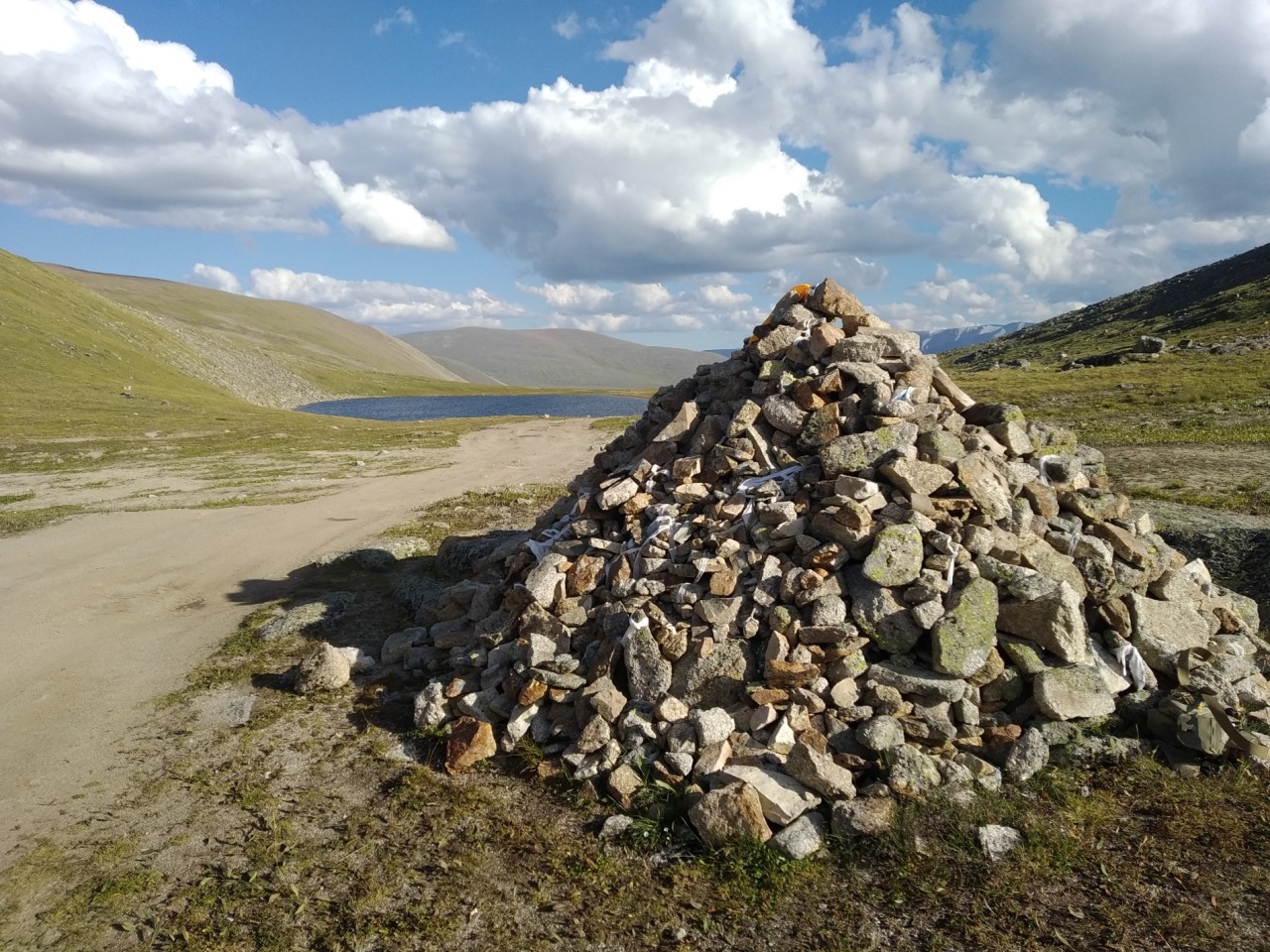 Шли дружно по 45 минут. Затем по 15 сидели, отдыхали. Сперва двигались по топким болотинам. Под ногами хлюпало. Затем кабрирование на пологий подъем. Вскоре и вовсе почва сделалась сухой и каменистой. Трава все более скудной. Перевалили через увал к концу третьего перехода. Здесь, пожалуй, заканчивалось Плато Укок. Дальше вздымались стены Барсова Ущелья. За ними и в стороне Снежные шапка Таван-Богда-Ула. По колено в воде перешли ручей. Возле громадных скальных останцев нашли идеальную плоскую скальную площадку. В это время увидели переваливших увал хипстеров. Работу пришлось приостановить. Мало ли хипстеры захотят разграбить заброску. Глаз работает с людьми и не доверяет не только коллегам, а даже туристам. Хипстеры прошли мимо не переправляясь ручей и лениво потянулись по той стороне на подъем в Барсово Ущелье.