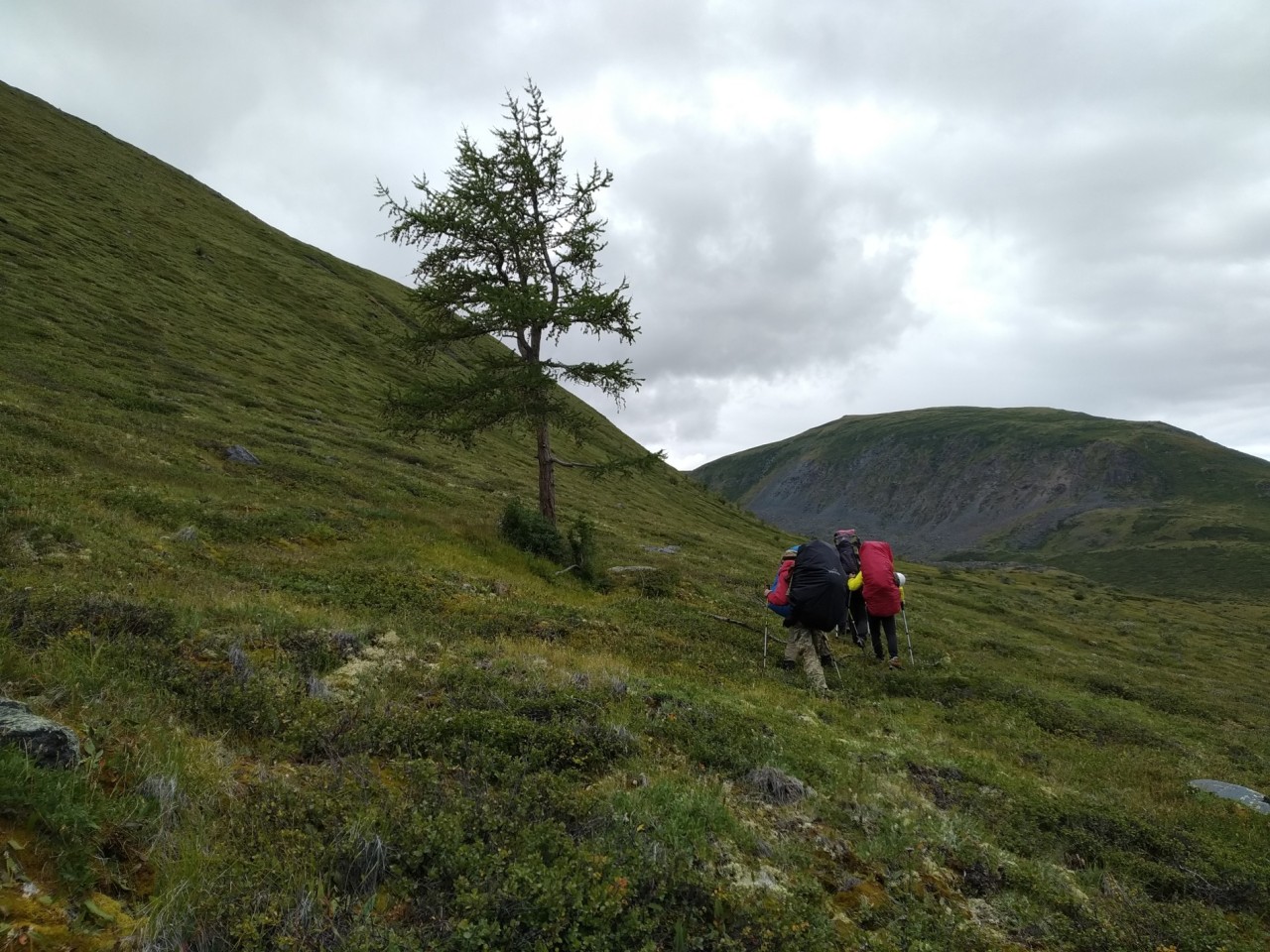 Незадолго до входа в каньон попался артефакт. Одинокая лиственница. Пожалуй, такая одна единственная на всем плоскогорье Укок. Больше не видели. Потом мы шли по правому борту ущелья постепенно в него подворачивая. Под ногами крупный курумник. Камни, поросшие лишайником казались зелеными.