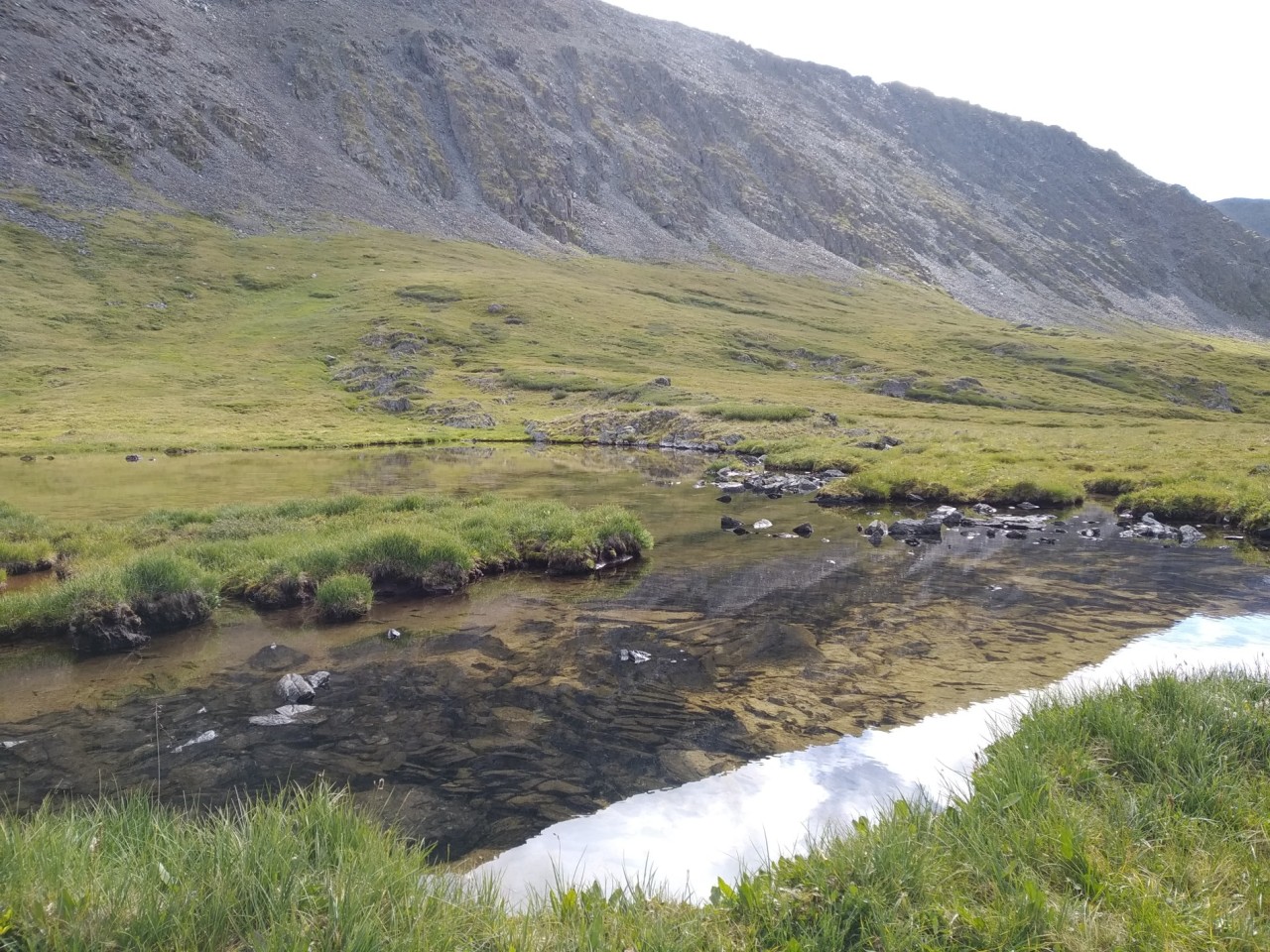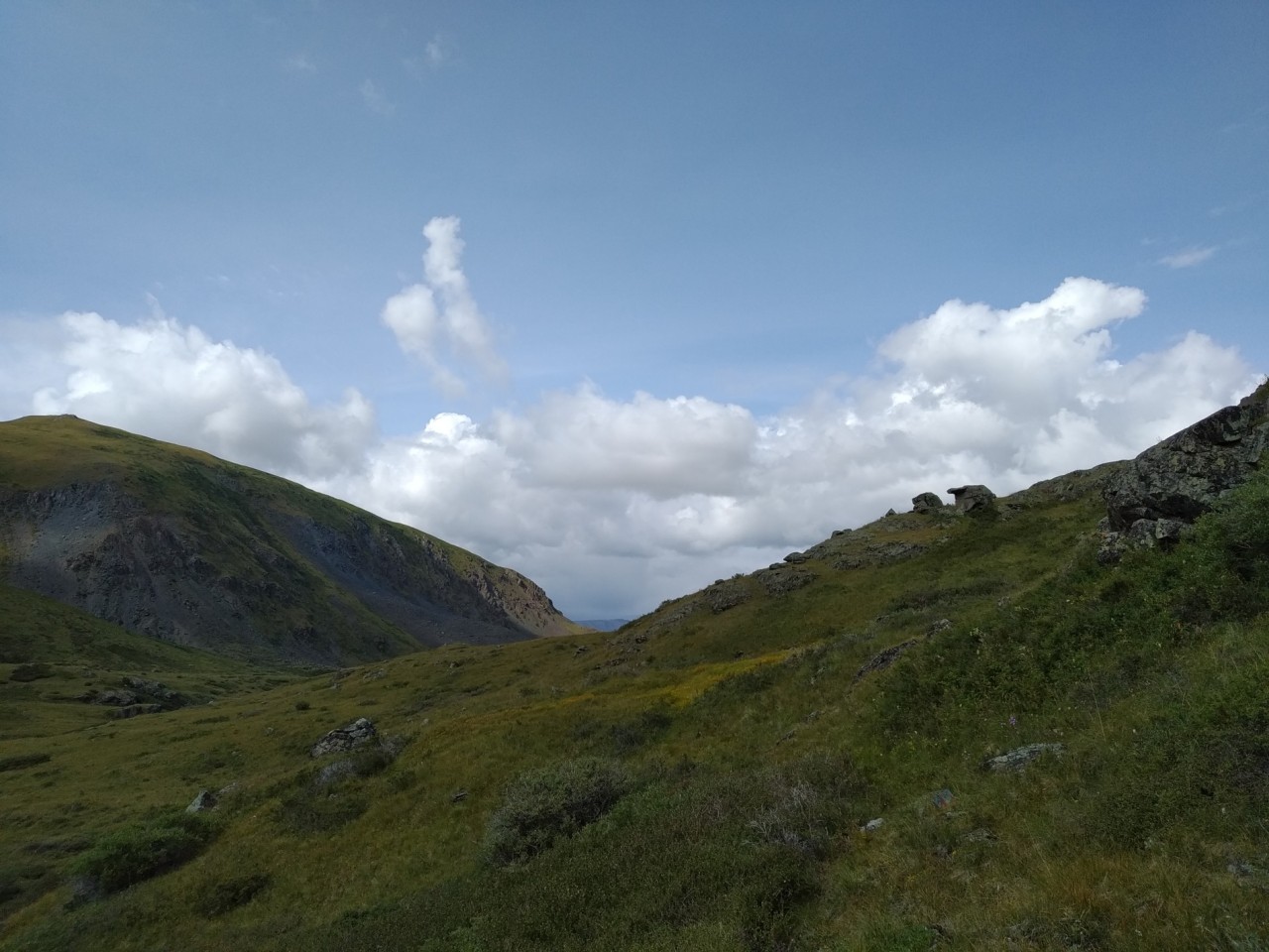 Сначала даже было что-то похожее на тропу, позднее её наметки уже не читались. Идти было удобно. Мы целый день шли по этому широкому каньону. Набор высоты пологий. Идти было не тяжело. Прошли таким образом две трети каньона. На хорошей карте были озерки. Повыше и пониже. Веселый Глаз к вечеру стал вырываться вперед. Поднялся по травянистому склону с обнажениями каменной осыпи – и вот они за перегибом эти самые озера.