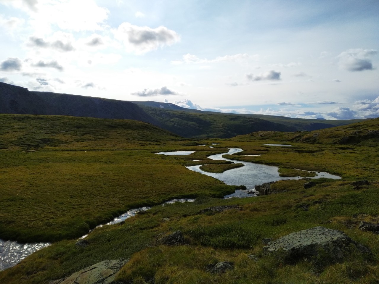 Шли еще часик. По неровным буграм, обходя небольшие окна-озерки, перескакивая ручьи. То каменистыми участками, где-то обходя кусты, или по кочкам или через участки лиственного стланника. Каньон Чолок Чат был еще далеко, чтобы сегодня в него войти, но приблизился ощутимо. Для лагеря Глаз облюбовал симпатичные площадки в виде каменной крошки. В визуальной близости расположилось озеро в несколько гектар. У нас трава, стланик и замечательные проточные тундровые лужи. Весело тогда было. Хорошо.