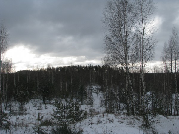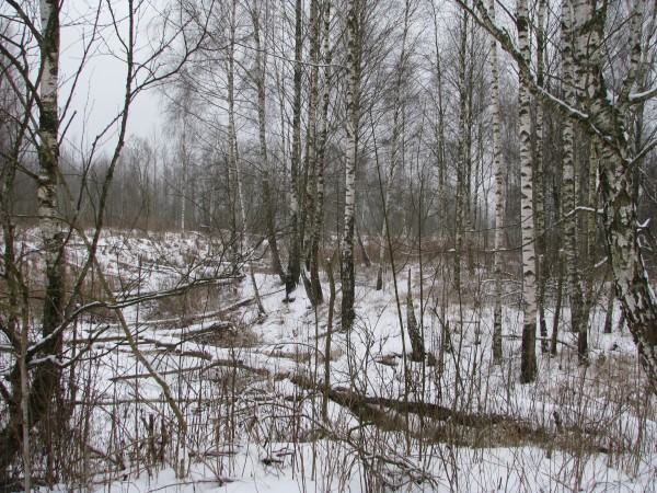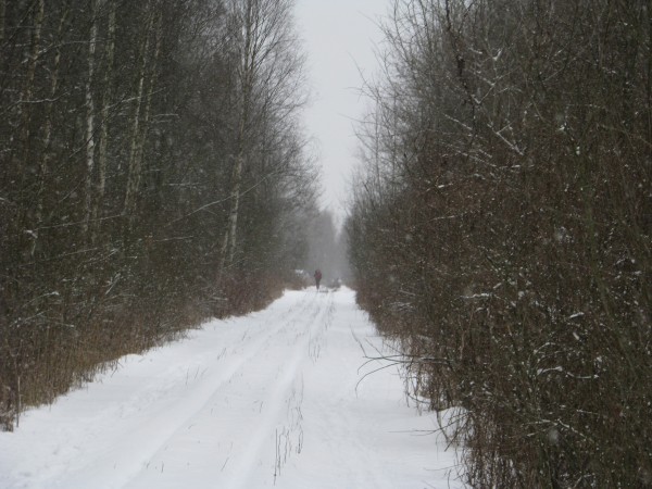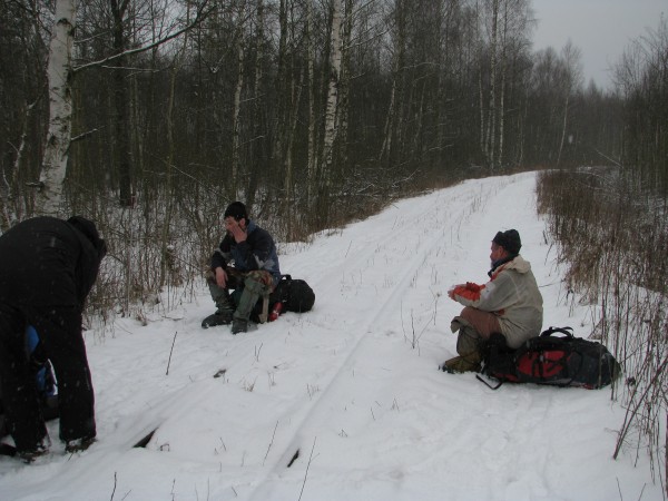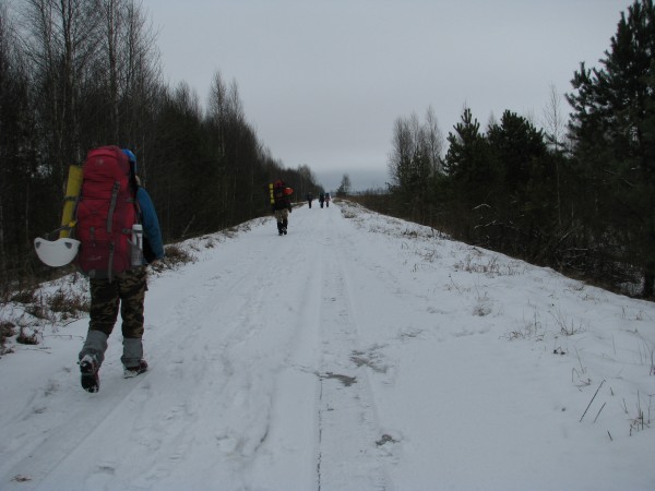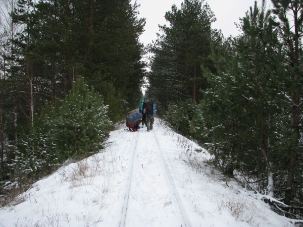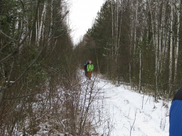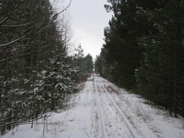 Першая частка маршрута праходзіла па закінутай вузкакалейцы. Чароўны зімні лес, з правага боку прагледжвалася змёрзлая дрыгва з невялічкімі меліярацыйнымі каналамі, час ад часу сустракаліся кінутыя іржавыя чыгуначныя вагоны, якія раней выкарыстоўваліся на торфараспрацоўках.